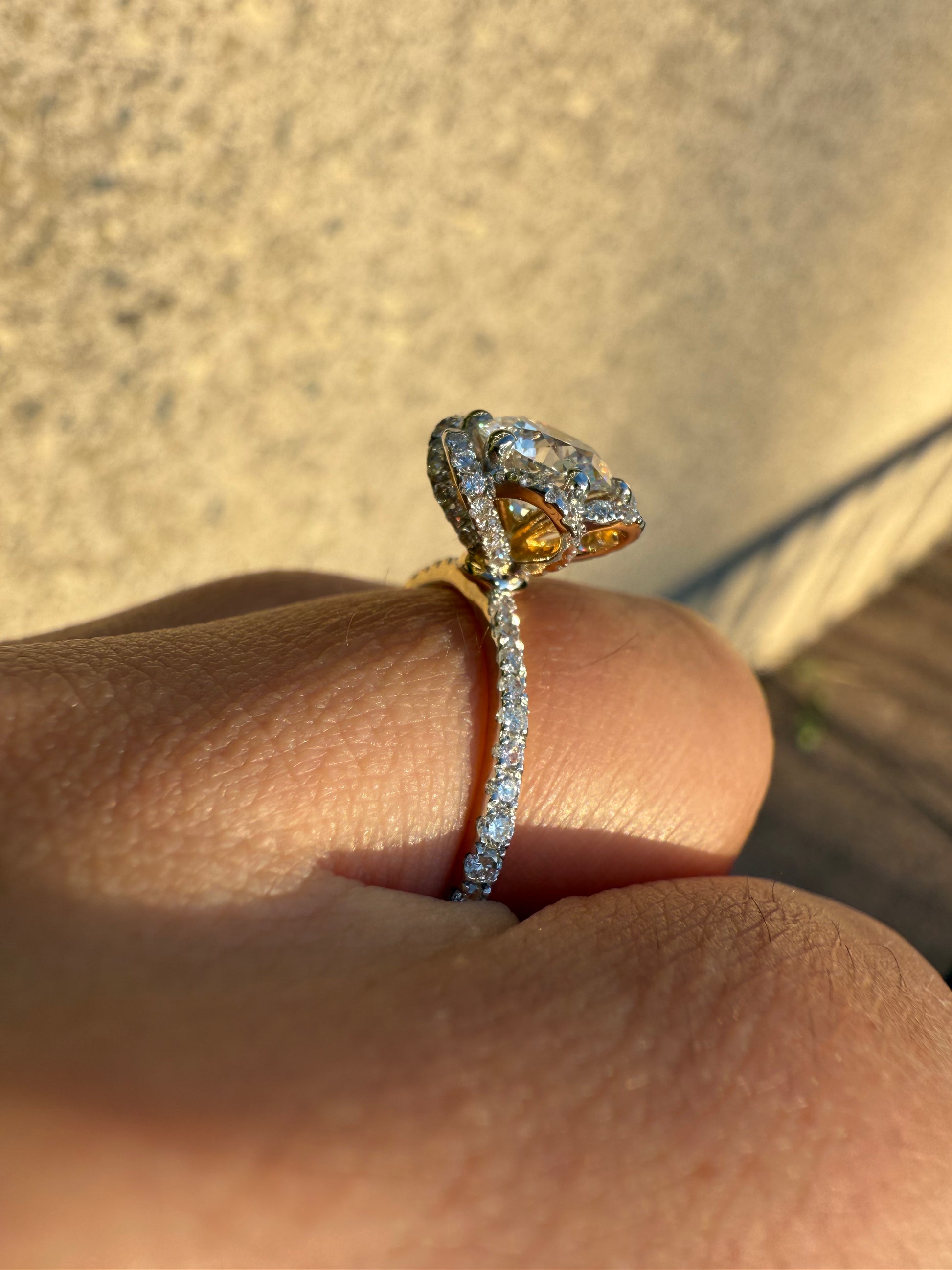 This exquisite engagement ring features a dazzling round brilliant cut centre stone, known for its unmatched sparkle and timeless elegance. Set in a unique, flower-inspired setting, the delicate petal-like details enhance the beauty of the diamond, creating a romantic and feminine look. Perfect for those seeking a one-of-a-kind diamond engagement ring that blends classic brilliance with artistic design. Ideal for brides who appreciate fine craftsmanship and floral-inspired diamond jewellery.