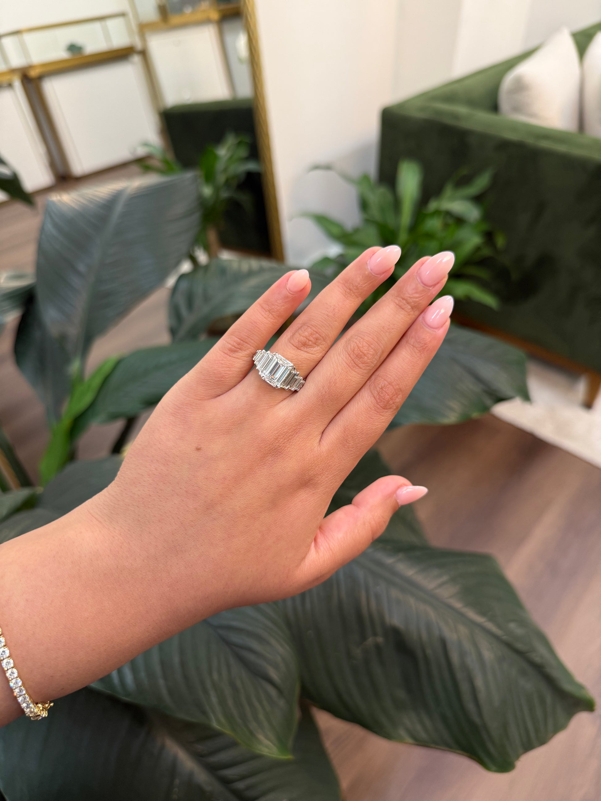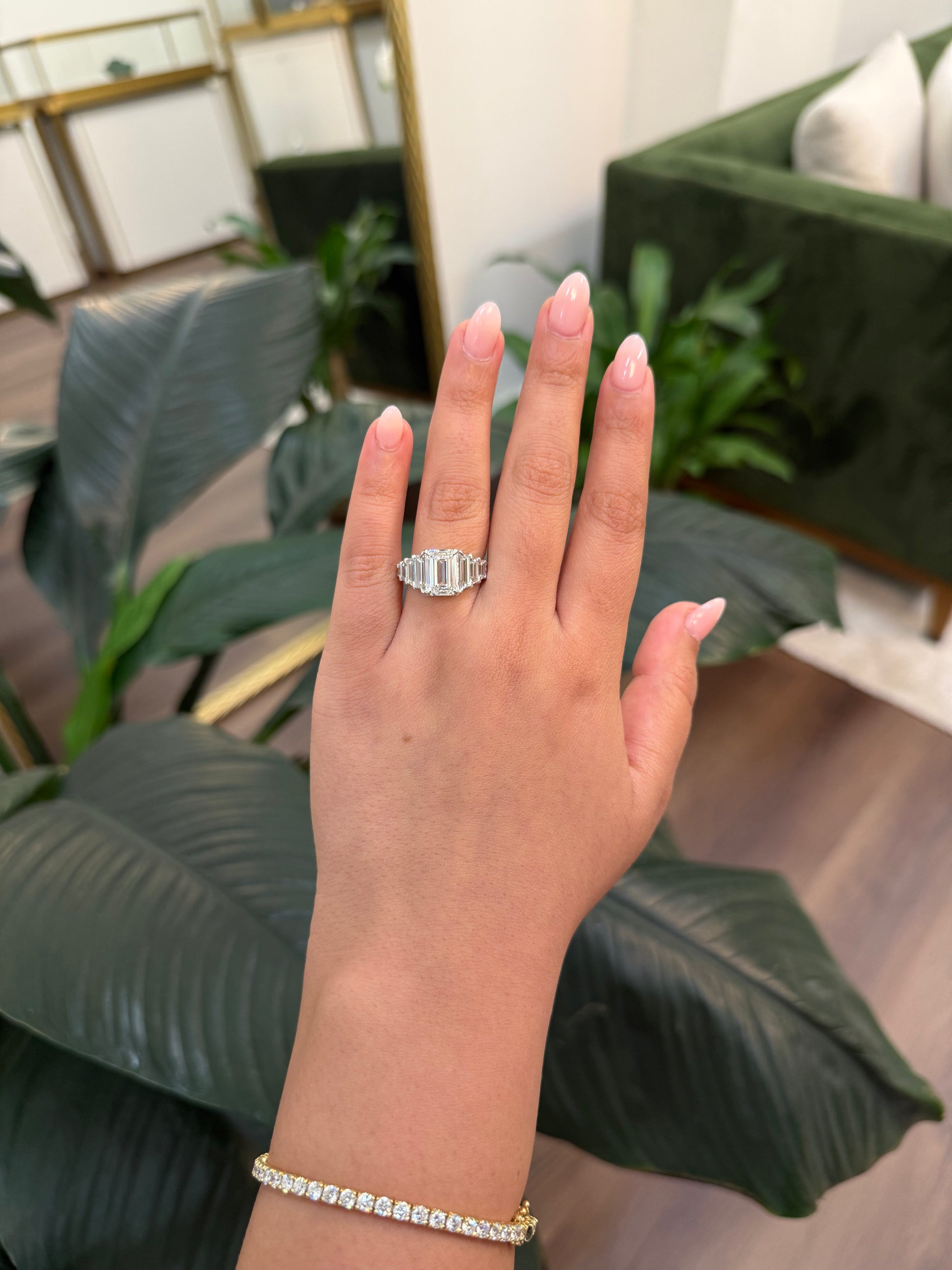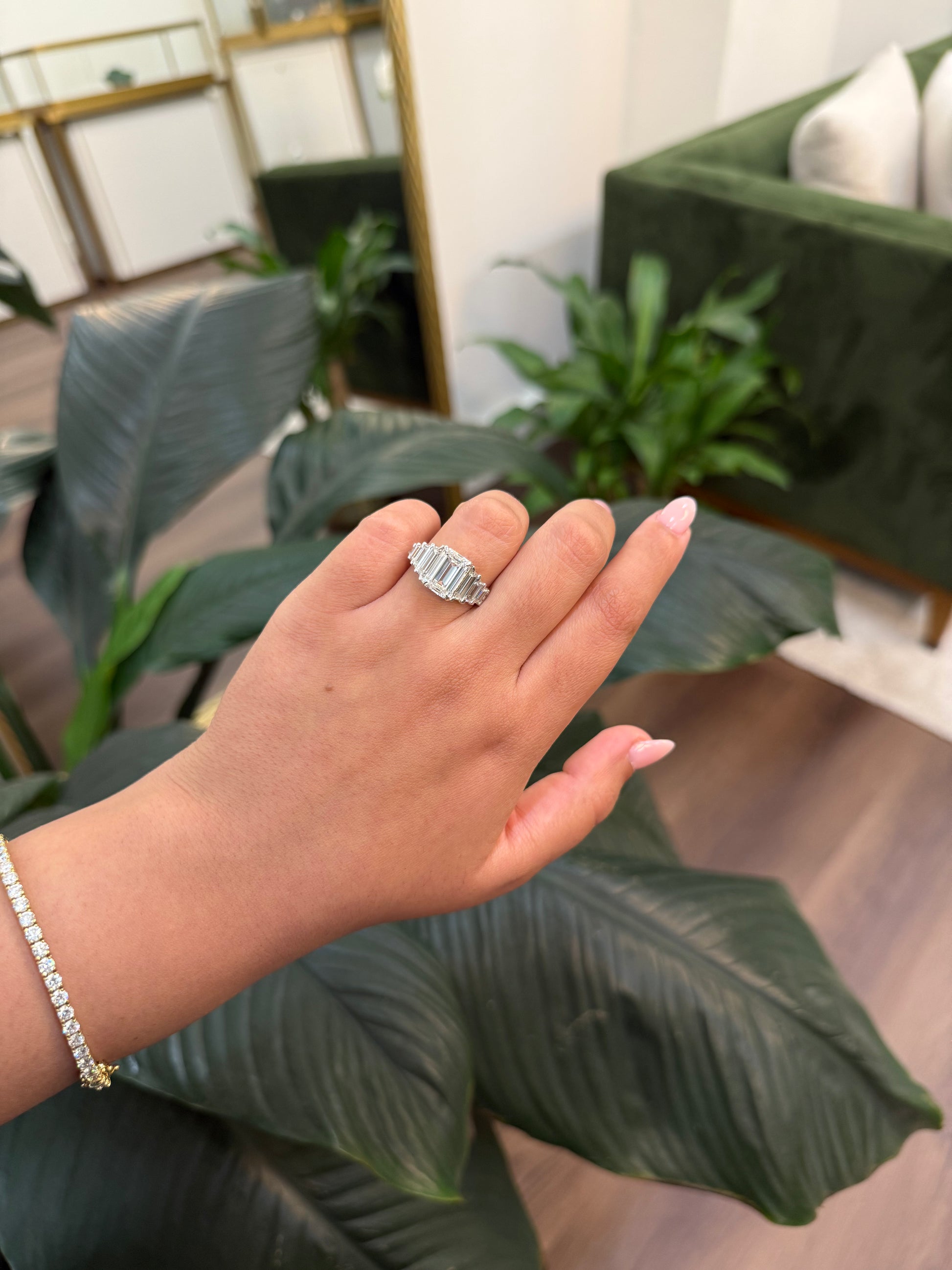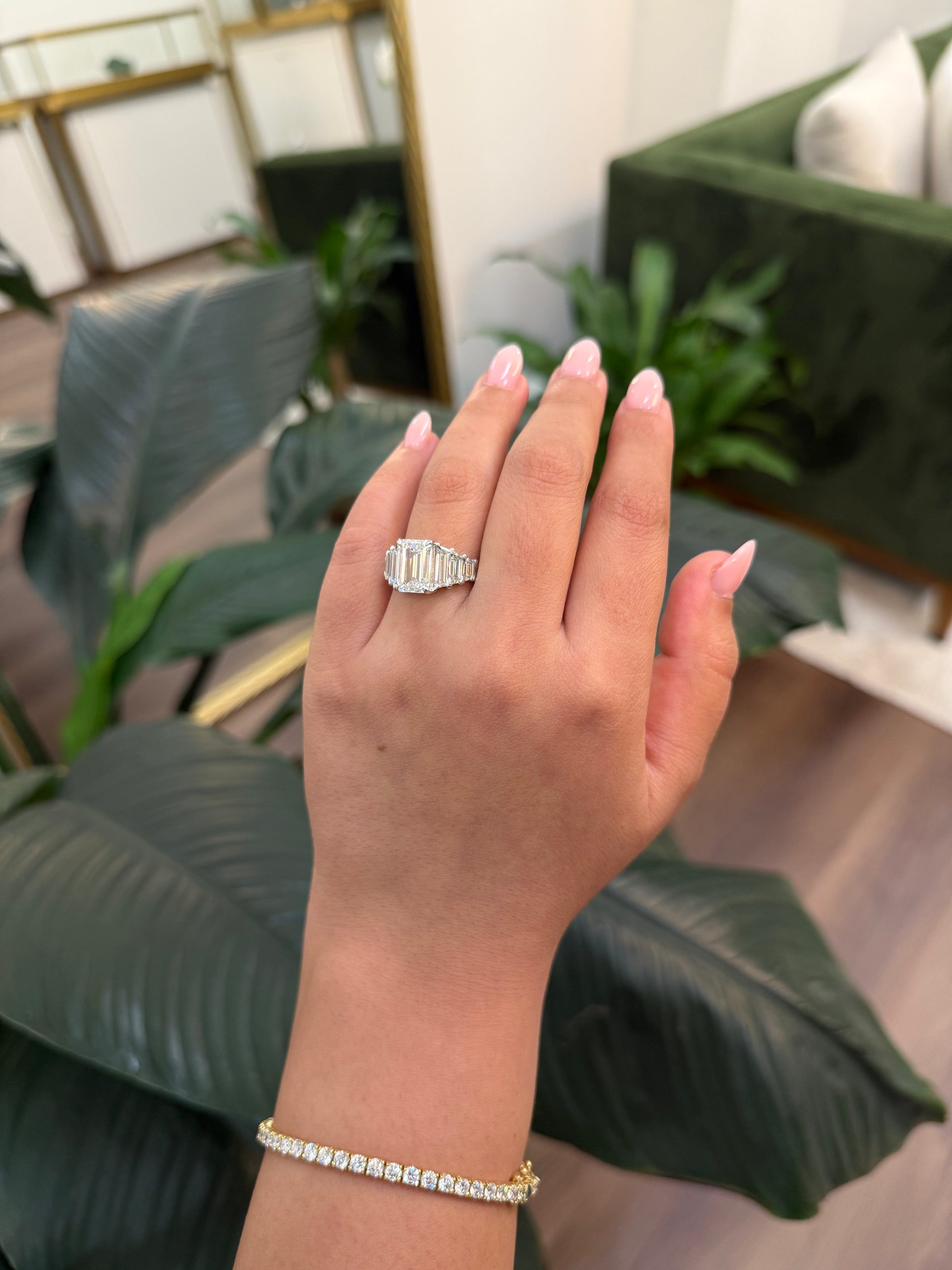 Armani is our Emerald cut solitaire with graduating trapezoid diamonds on the side in a low basket setting set in 18k White gold.