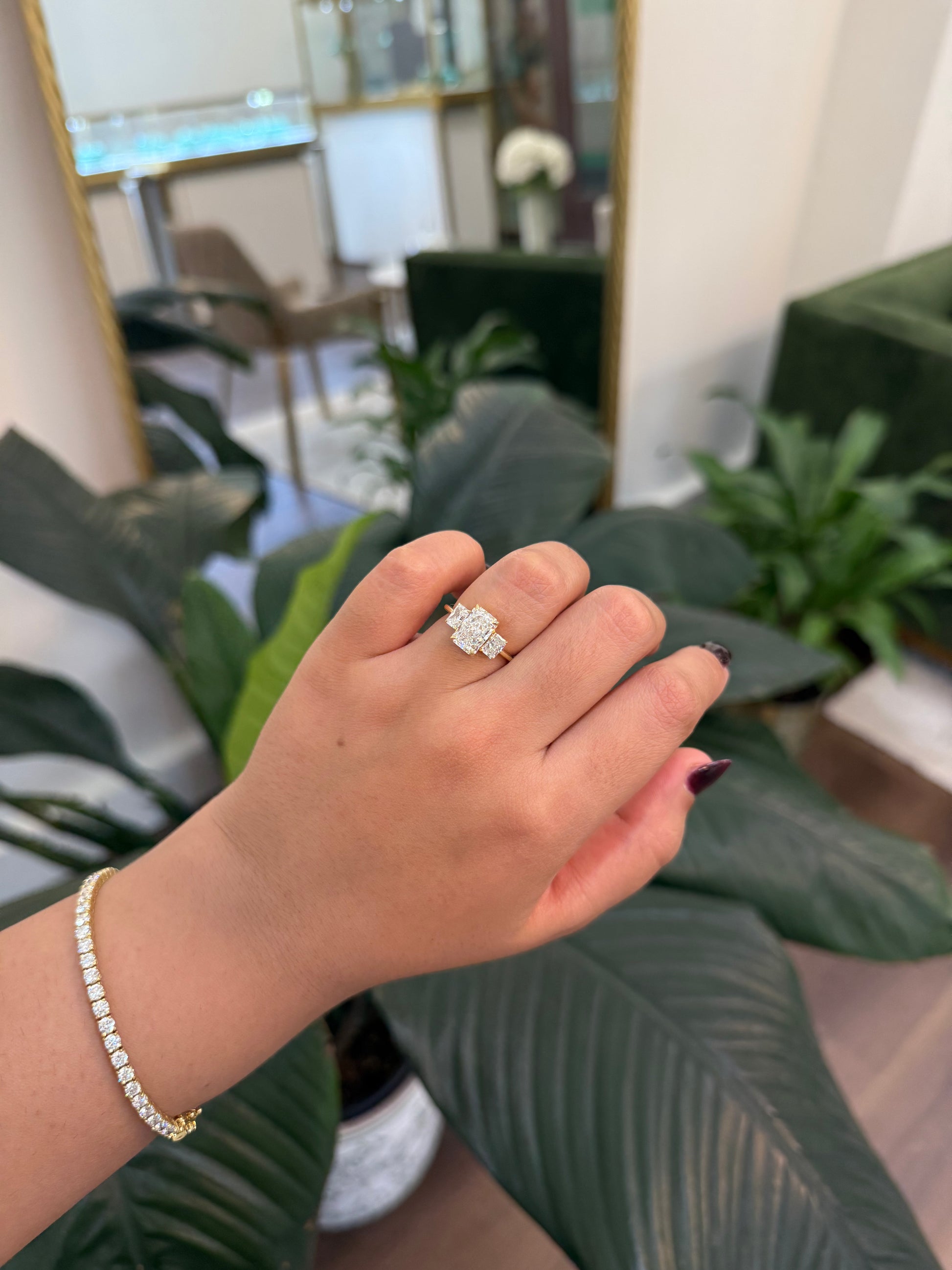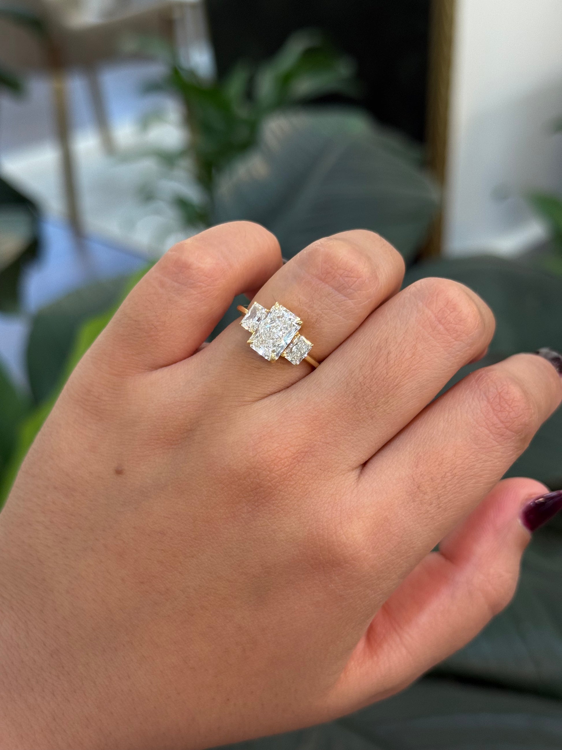 Our take on Classic Trilogy Ring with three matching Radiant Cut diamonds, each held with refined eagle claw setting. Low Basket set in 18k Yellow gold.