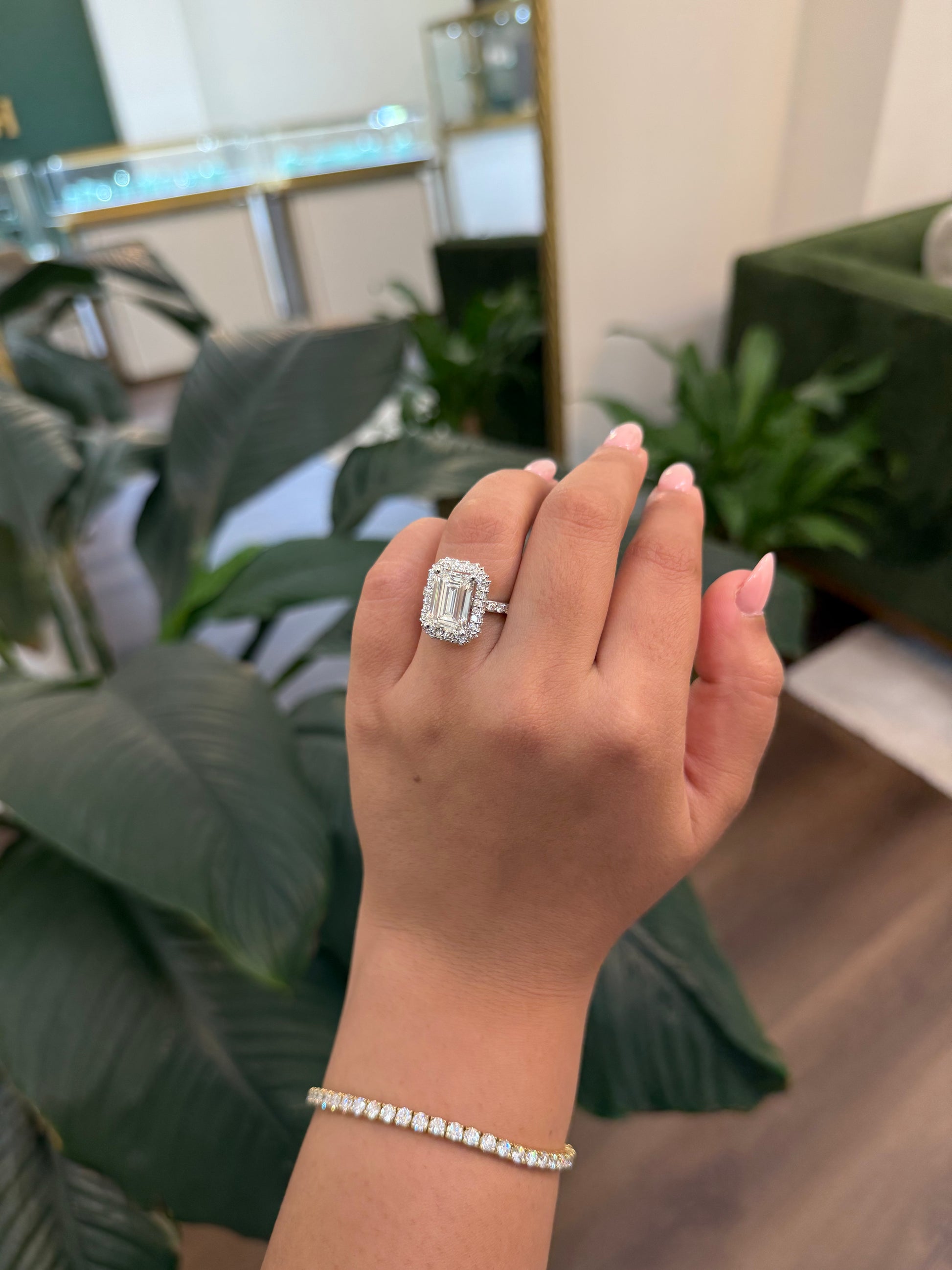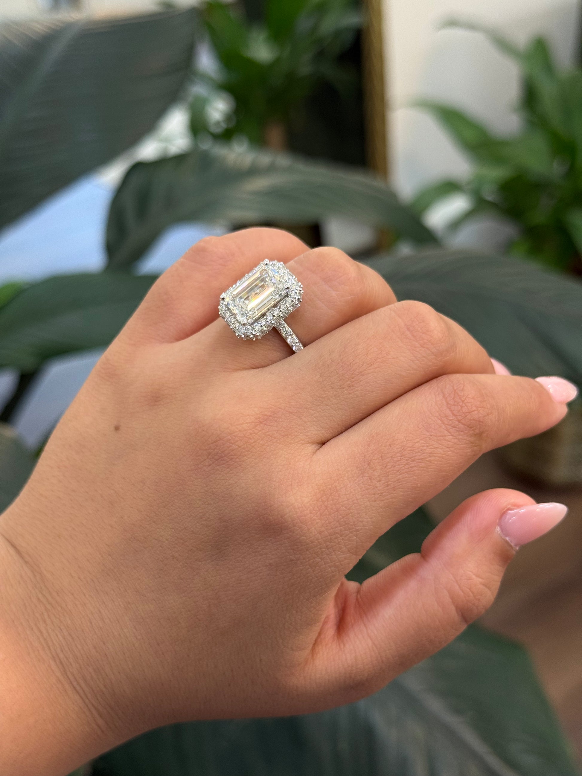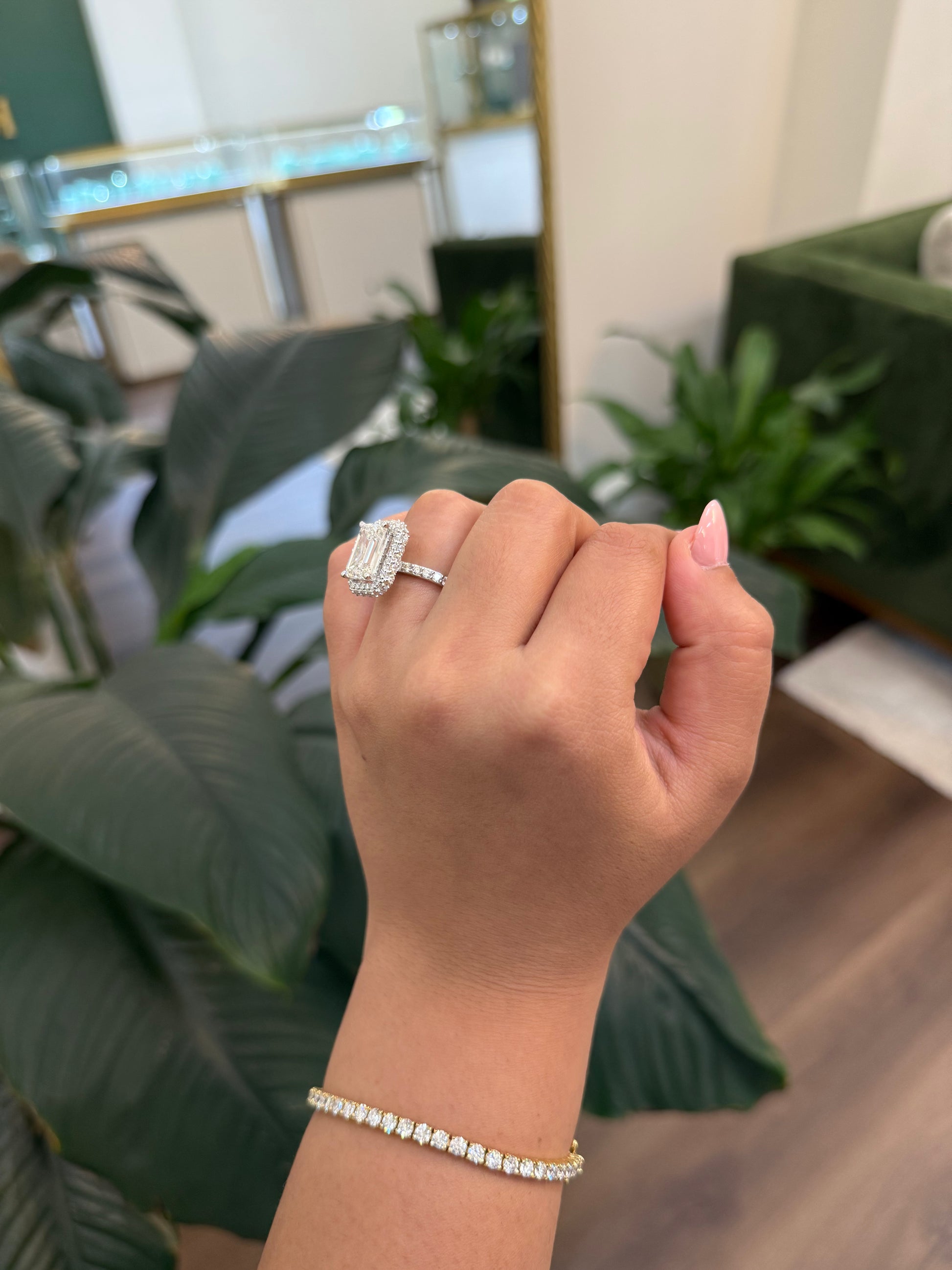 Emerald pavè Halo on a 4 prong setting, pavè band Lab Grown diamond Engagement ring