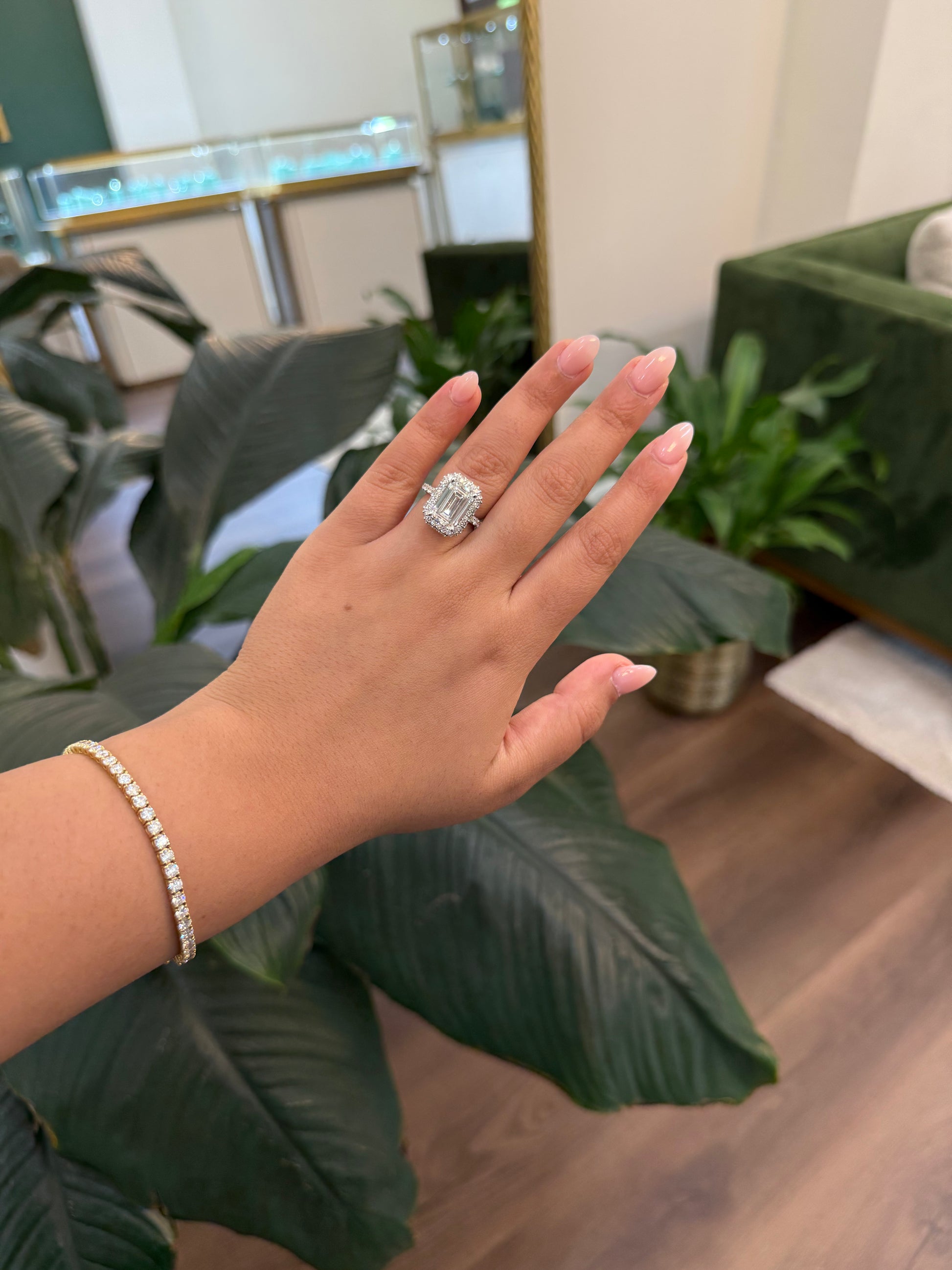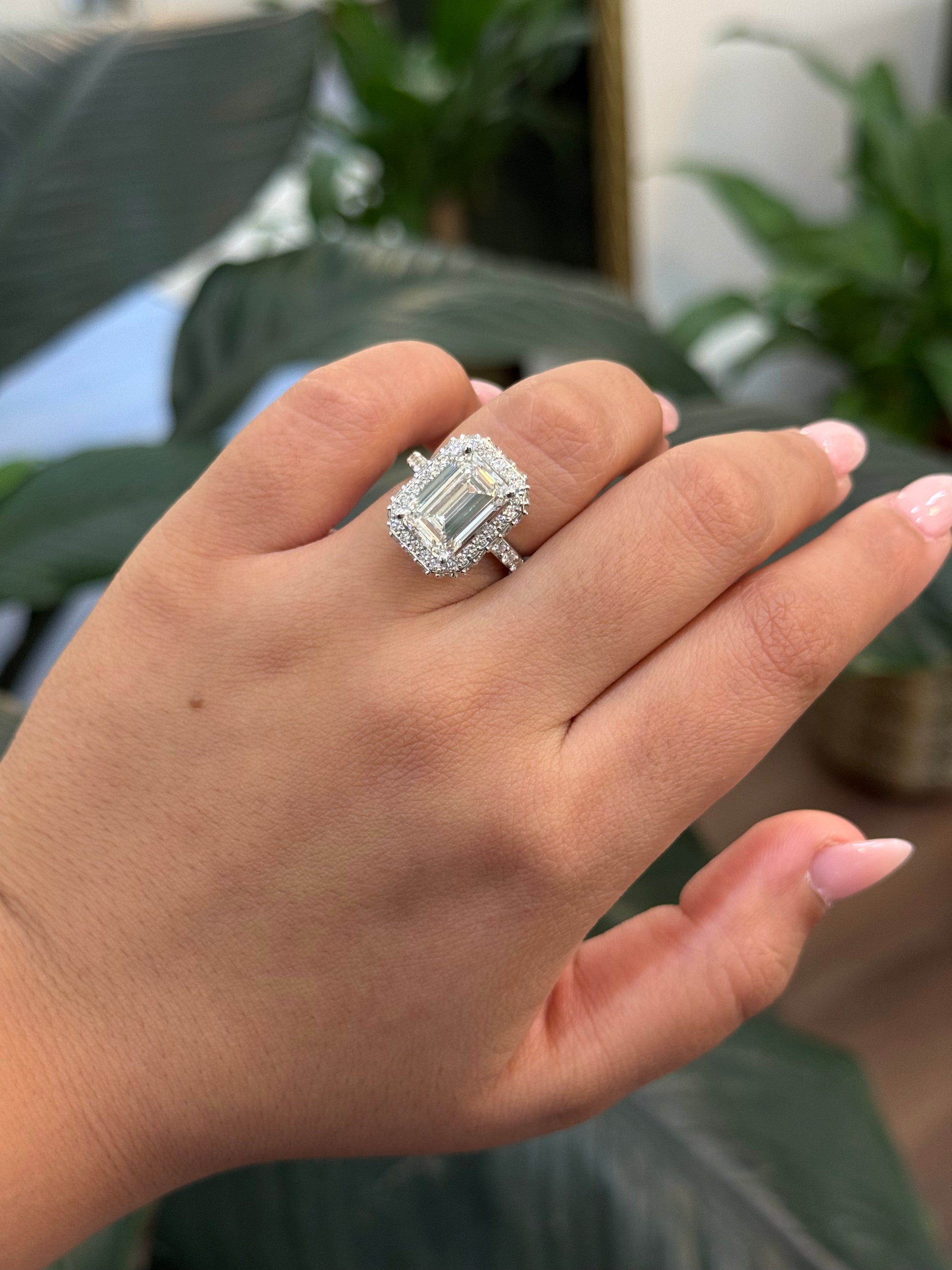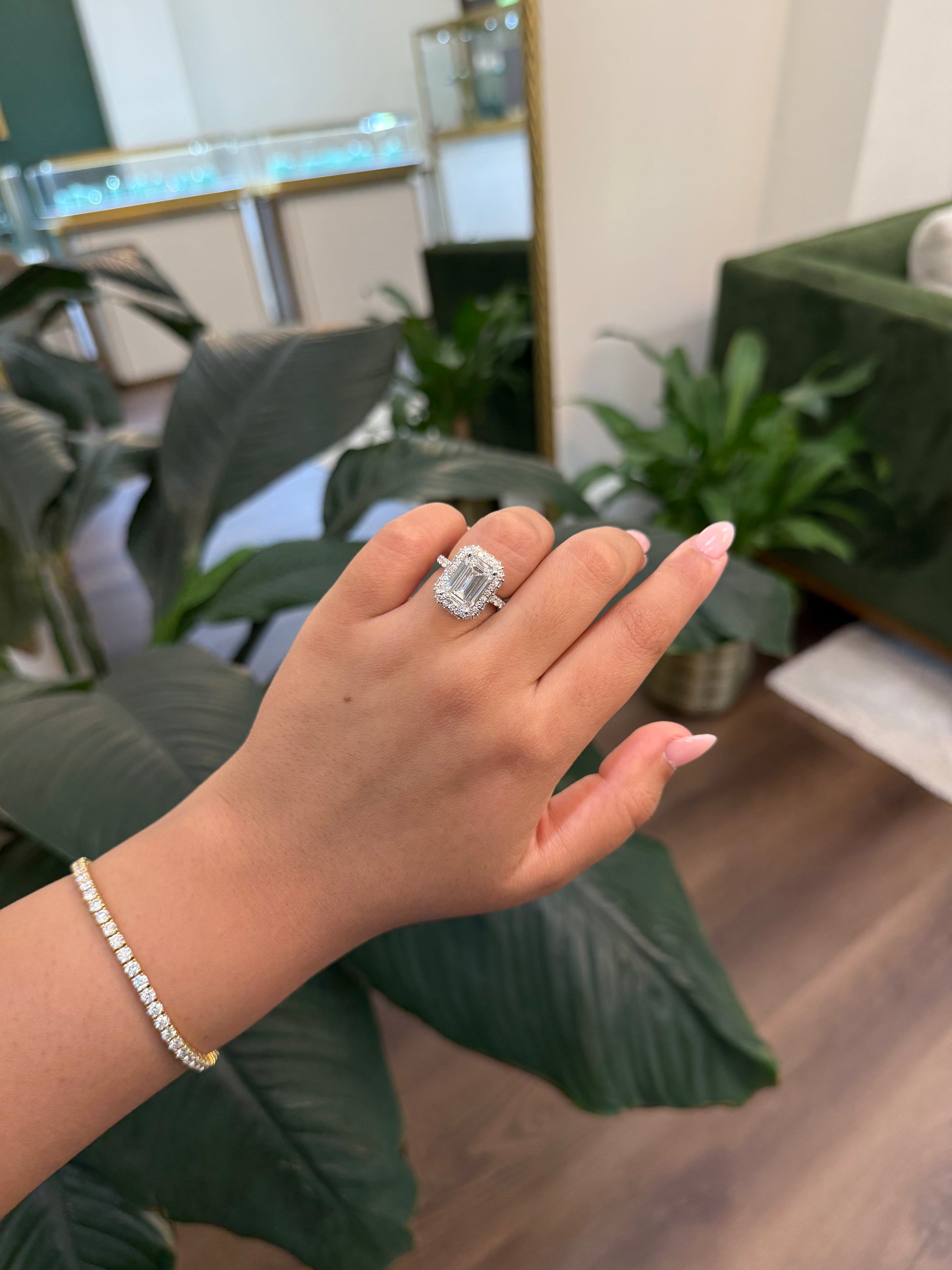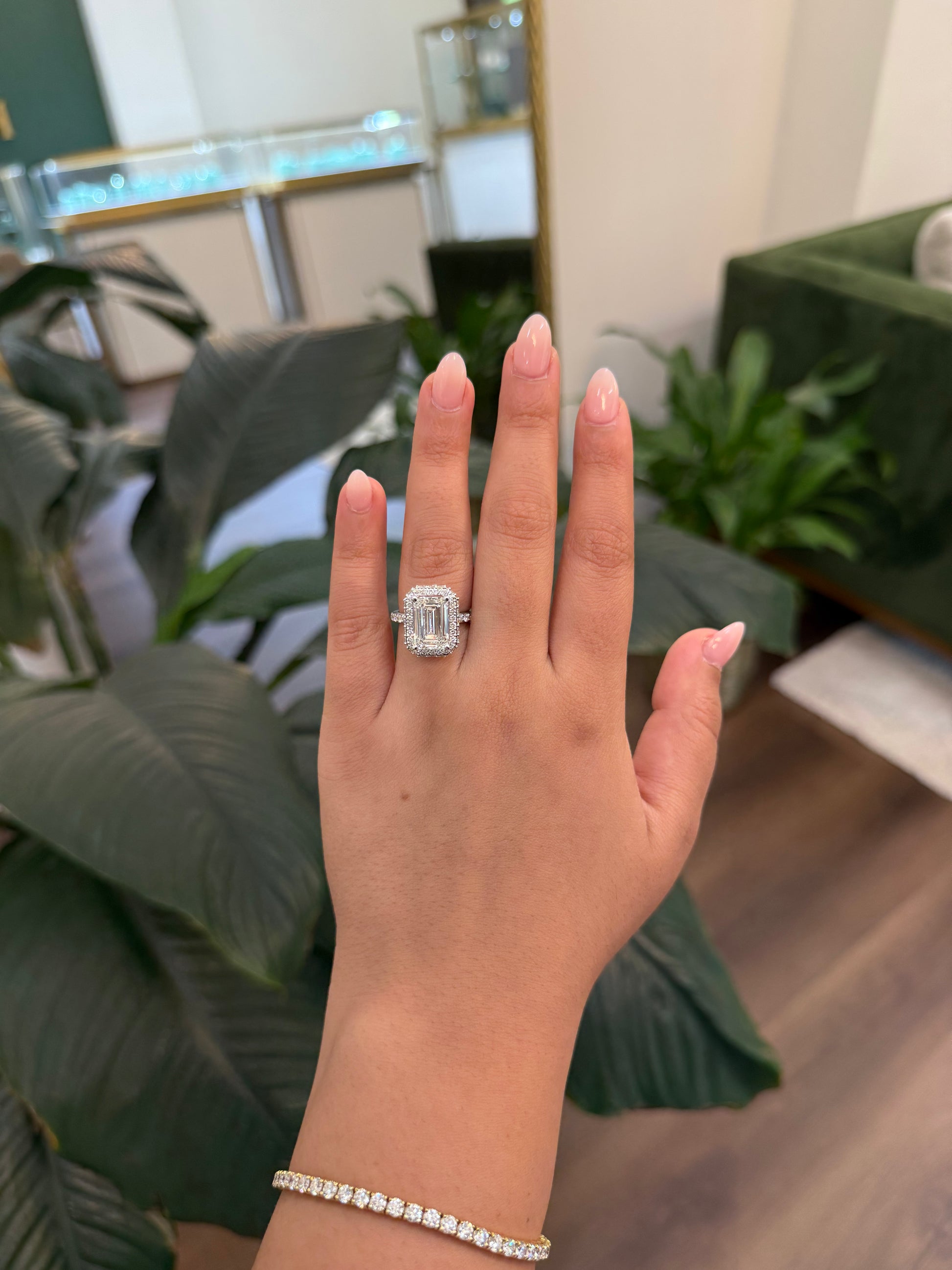 Emerald pavè Halo on a 4 prong setting, pavè band Lab Grown diamond Engagement ring