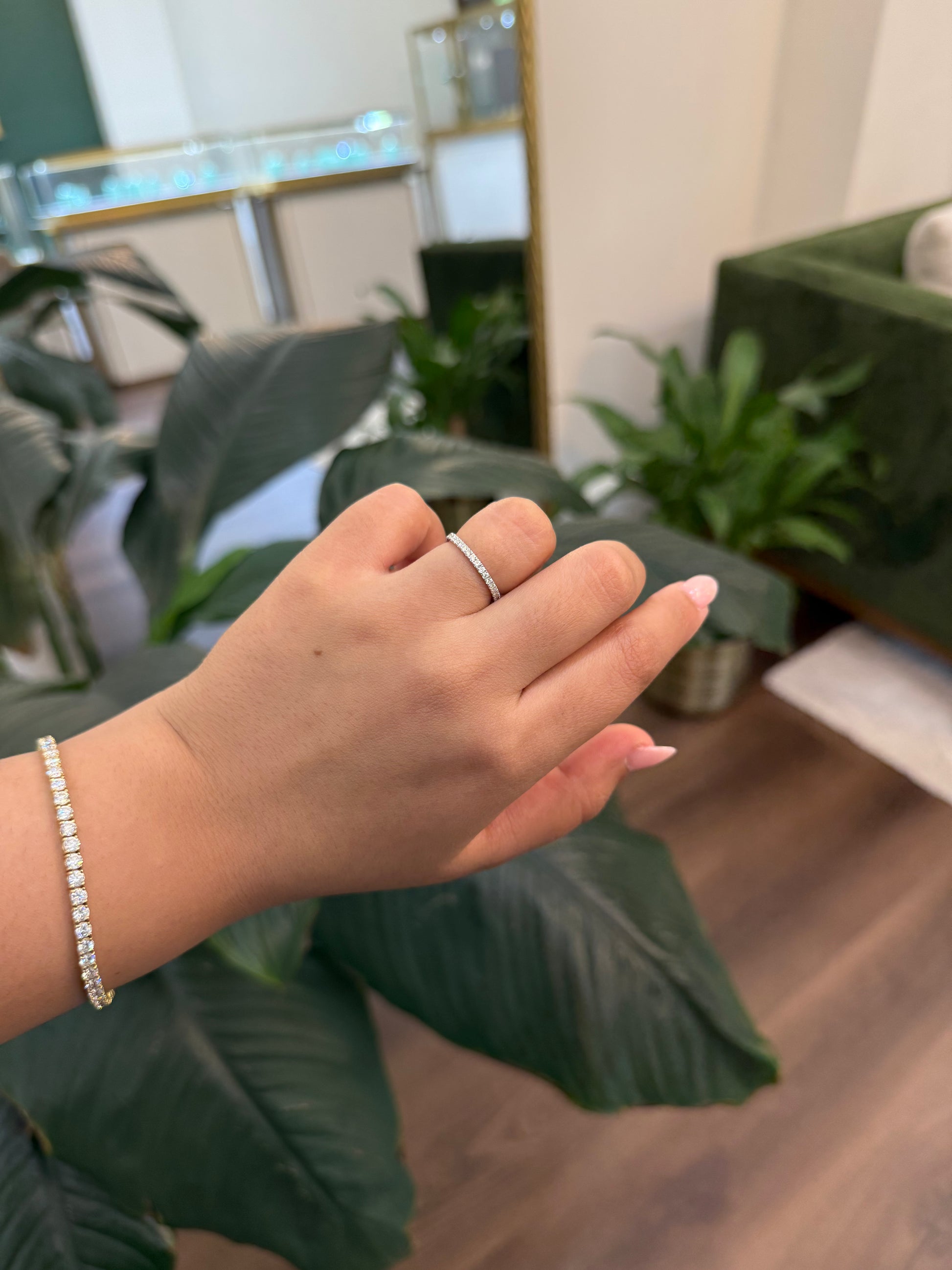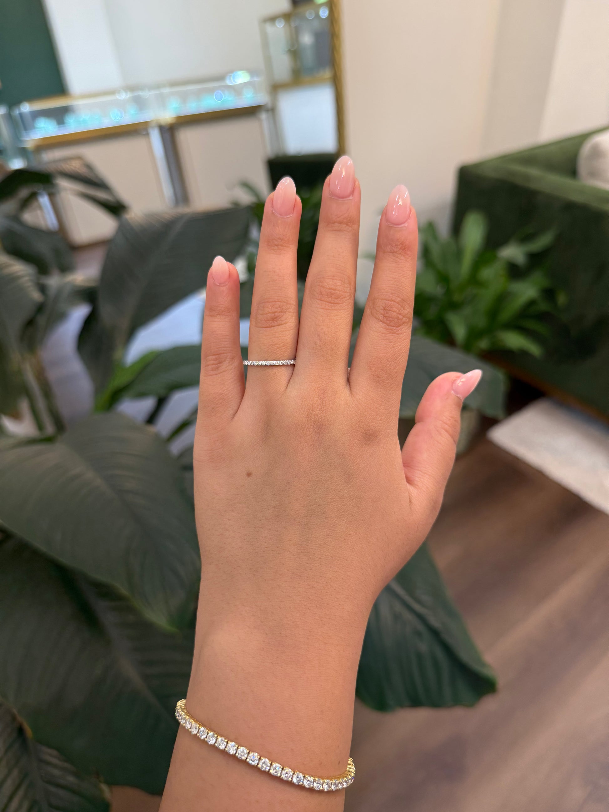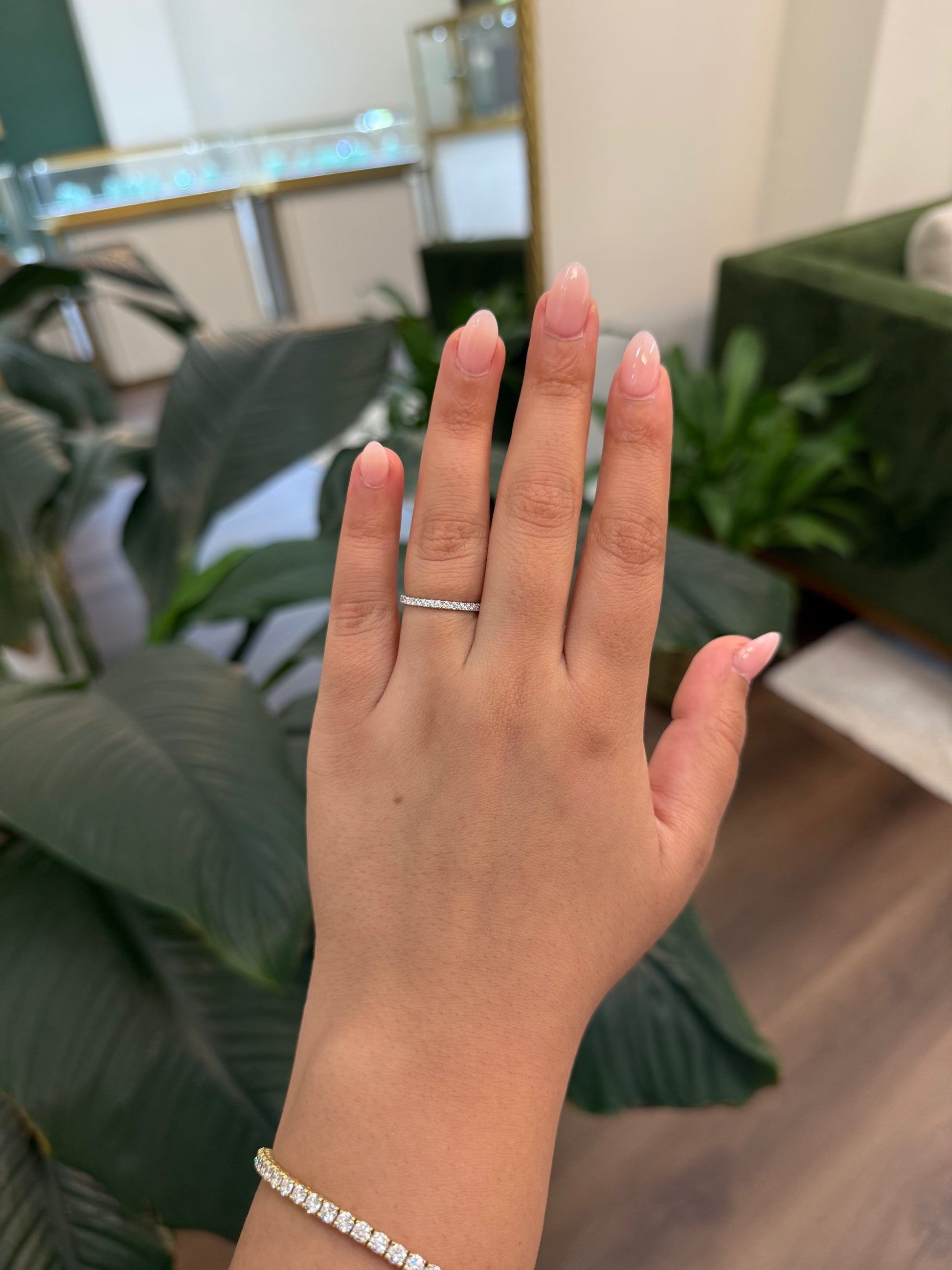 Clara is an exquisite pavé wedding ring with round cut stones extending all the way.