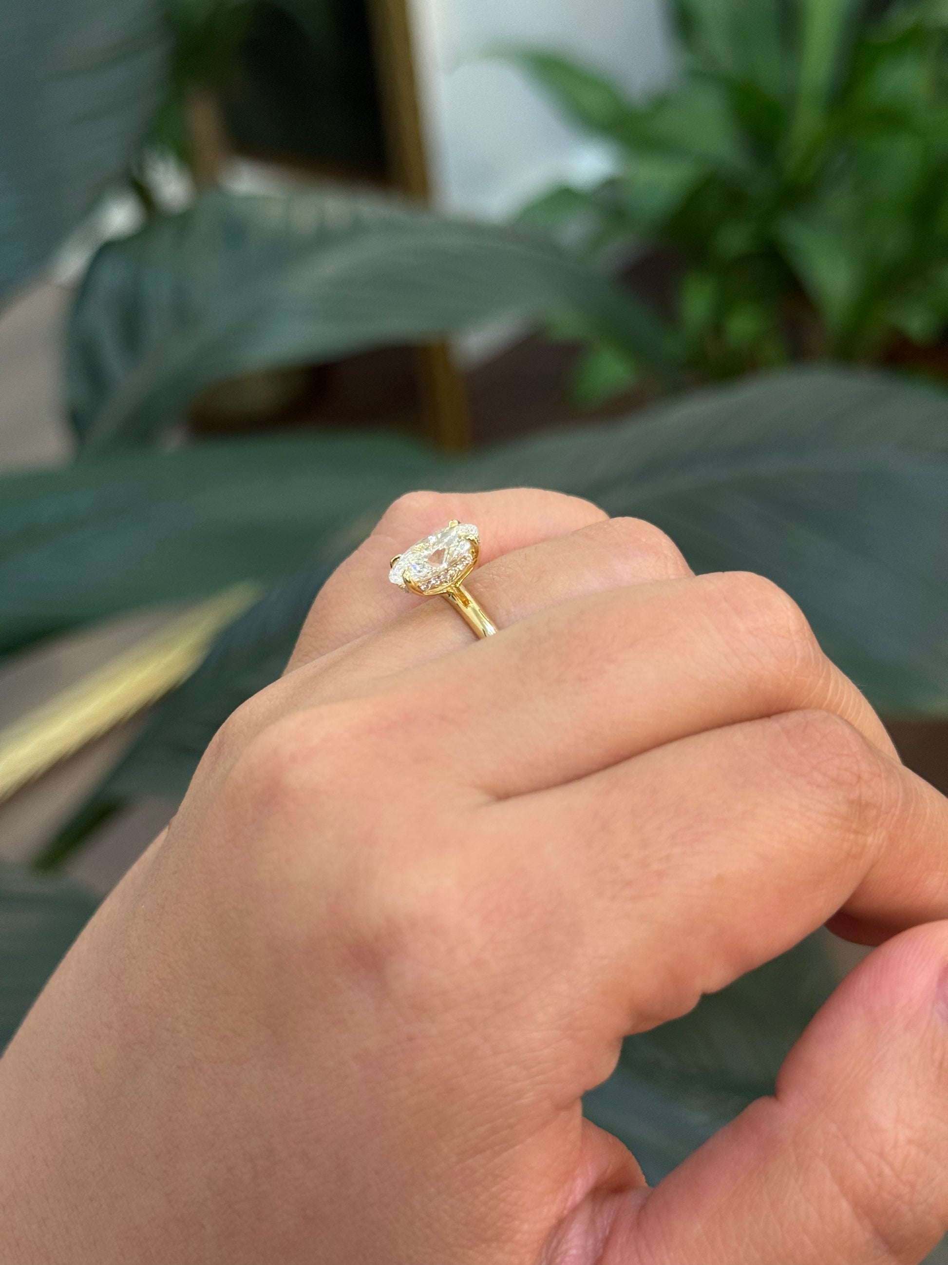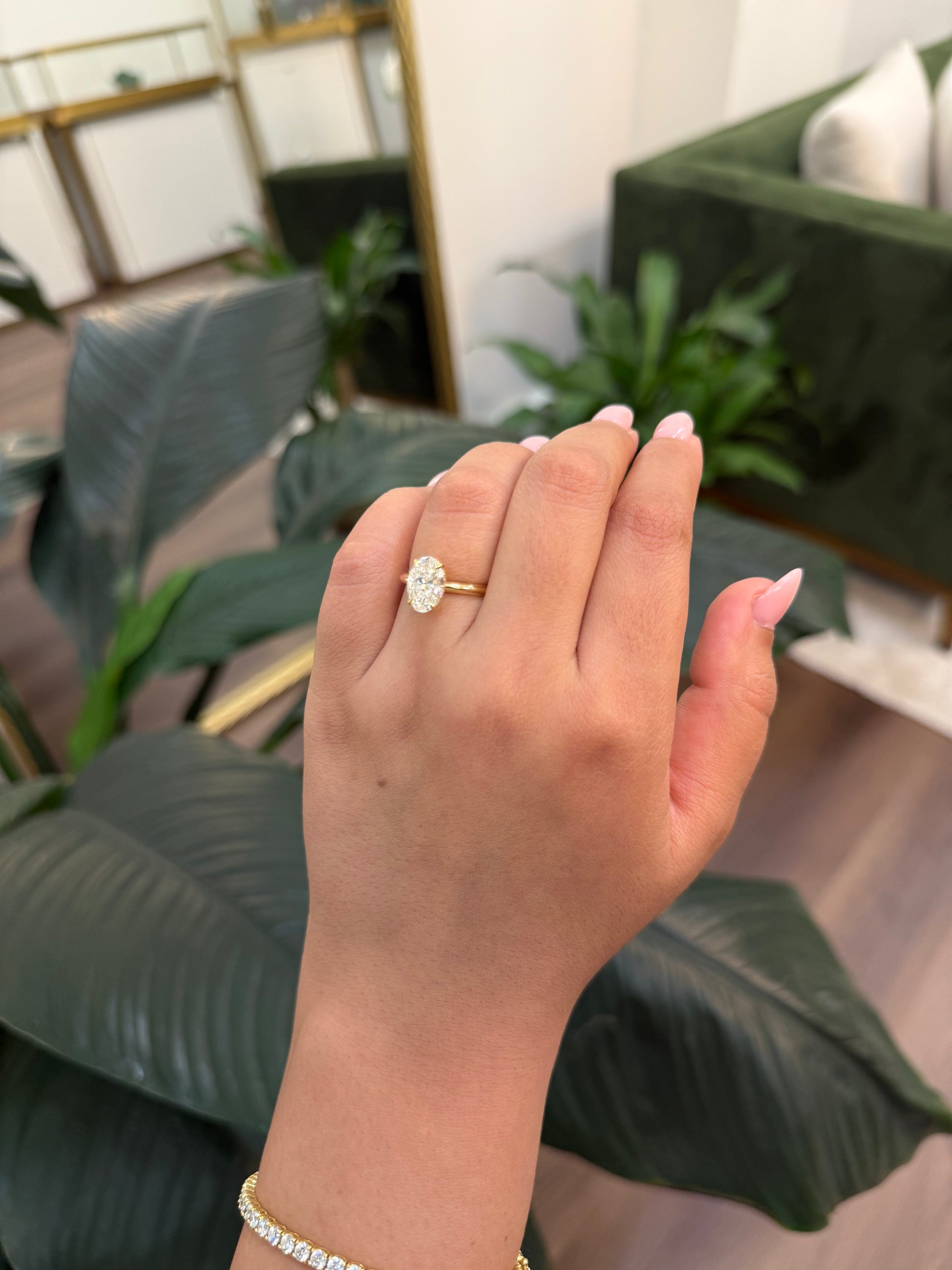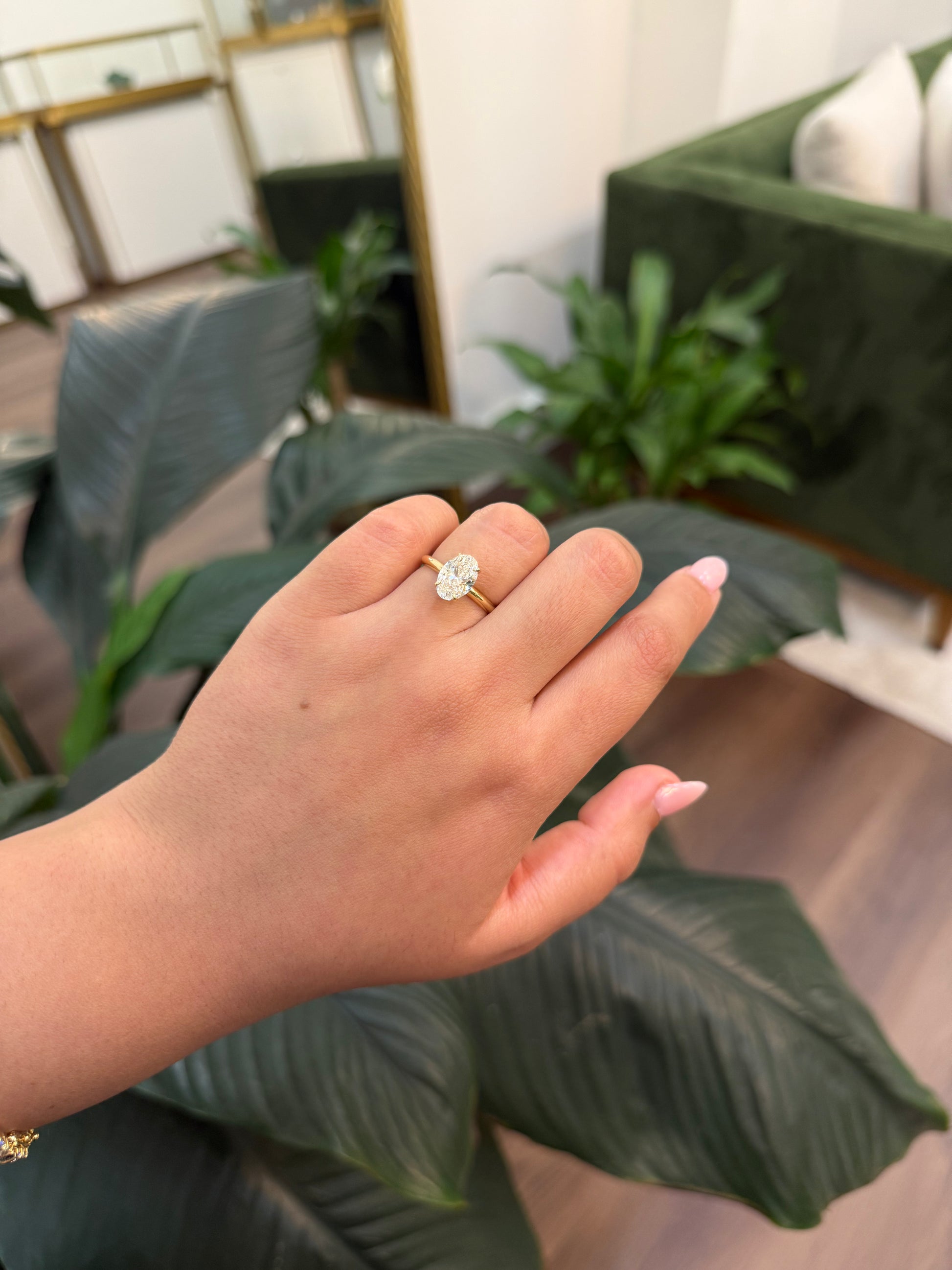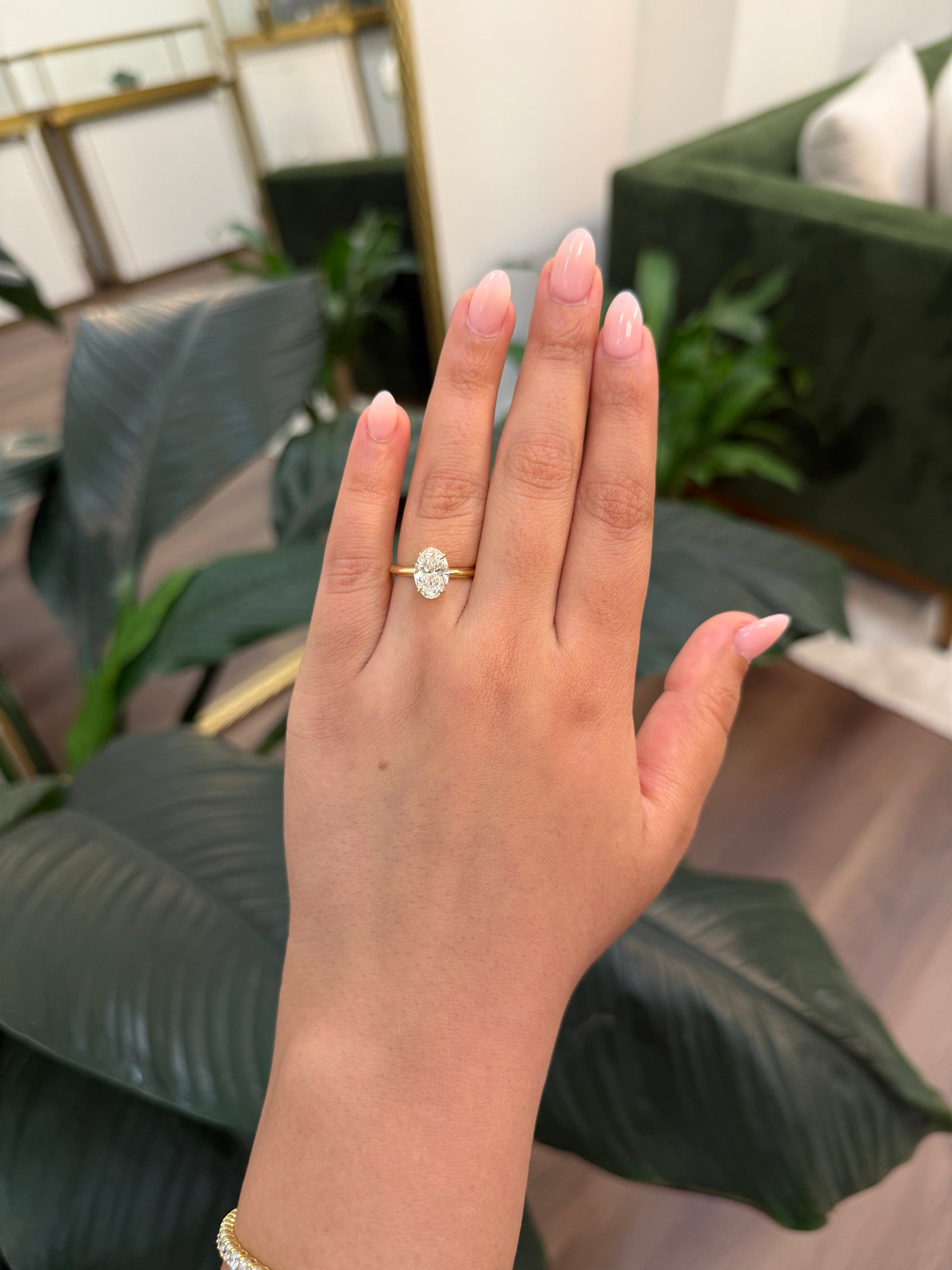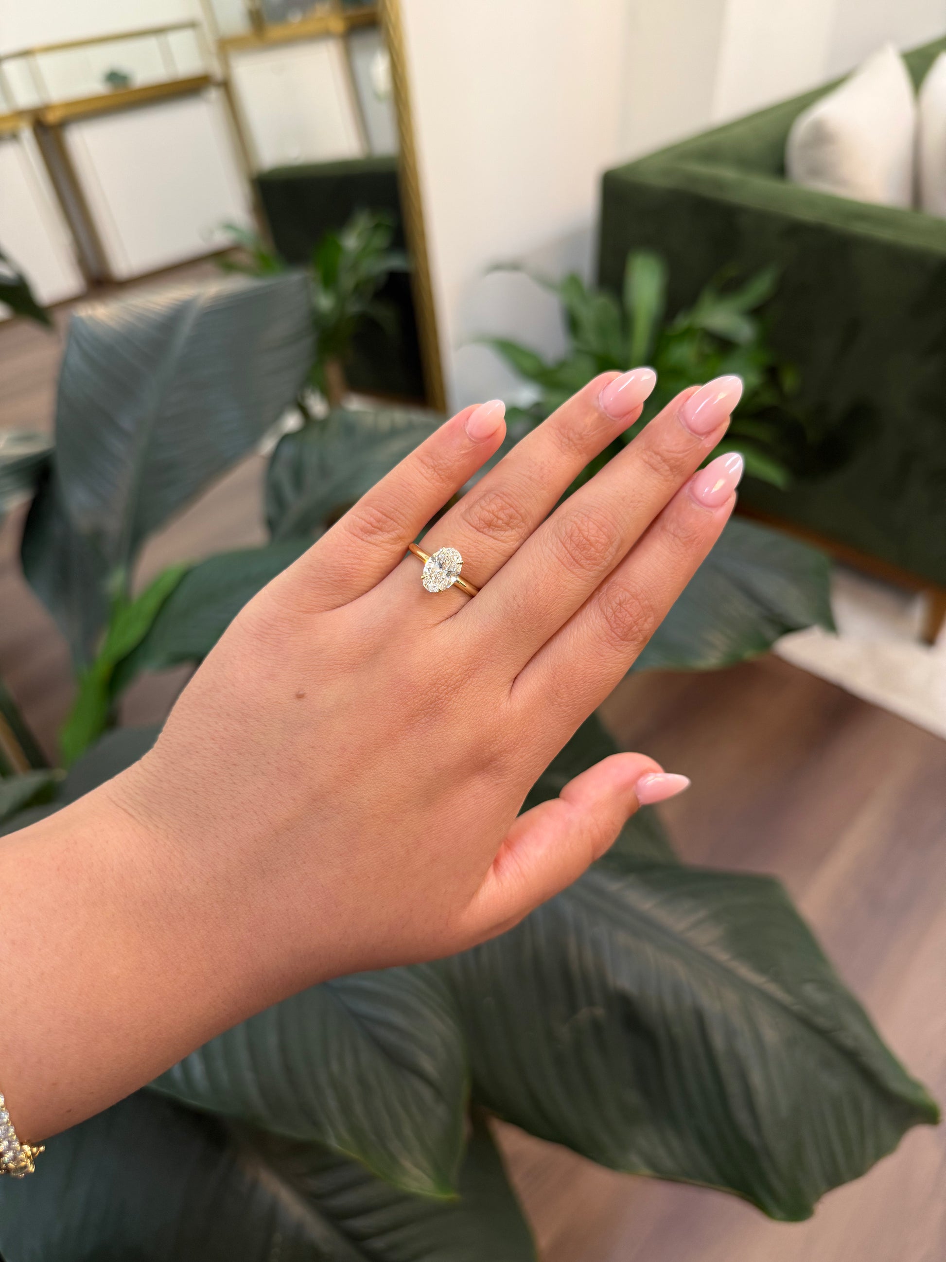 Our striking Ivy Solitaire features an Oval cut diamond set with four eagle-tipped claws, and a hidden halo in 18k solid Yellow Gold band.