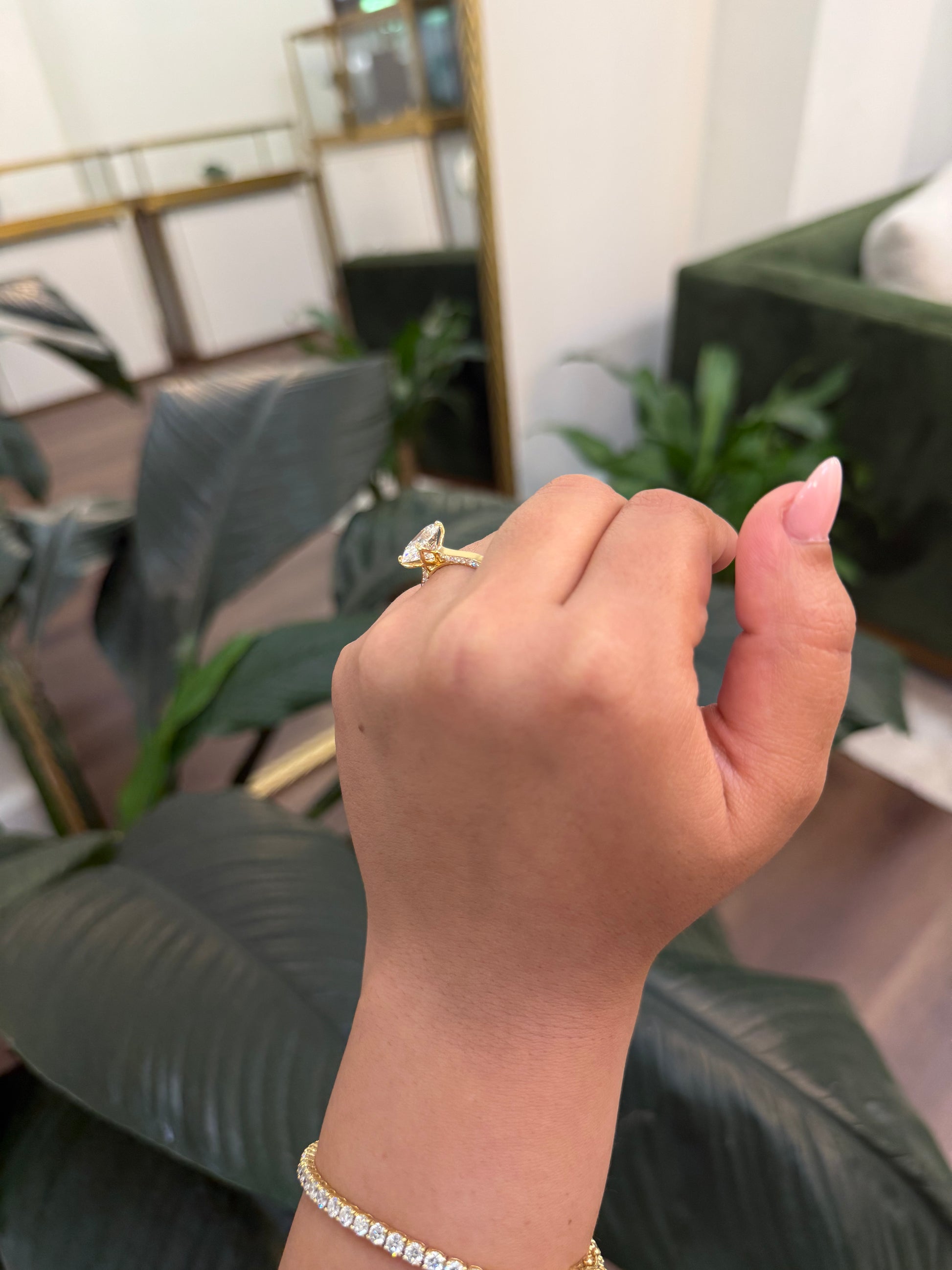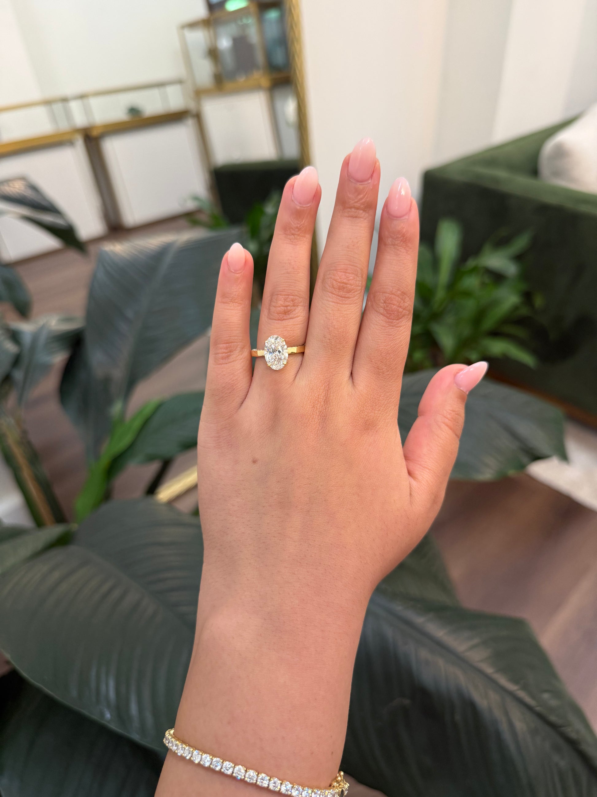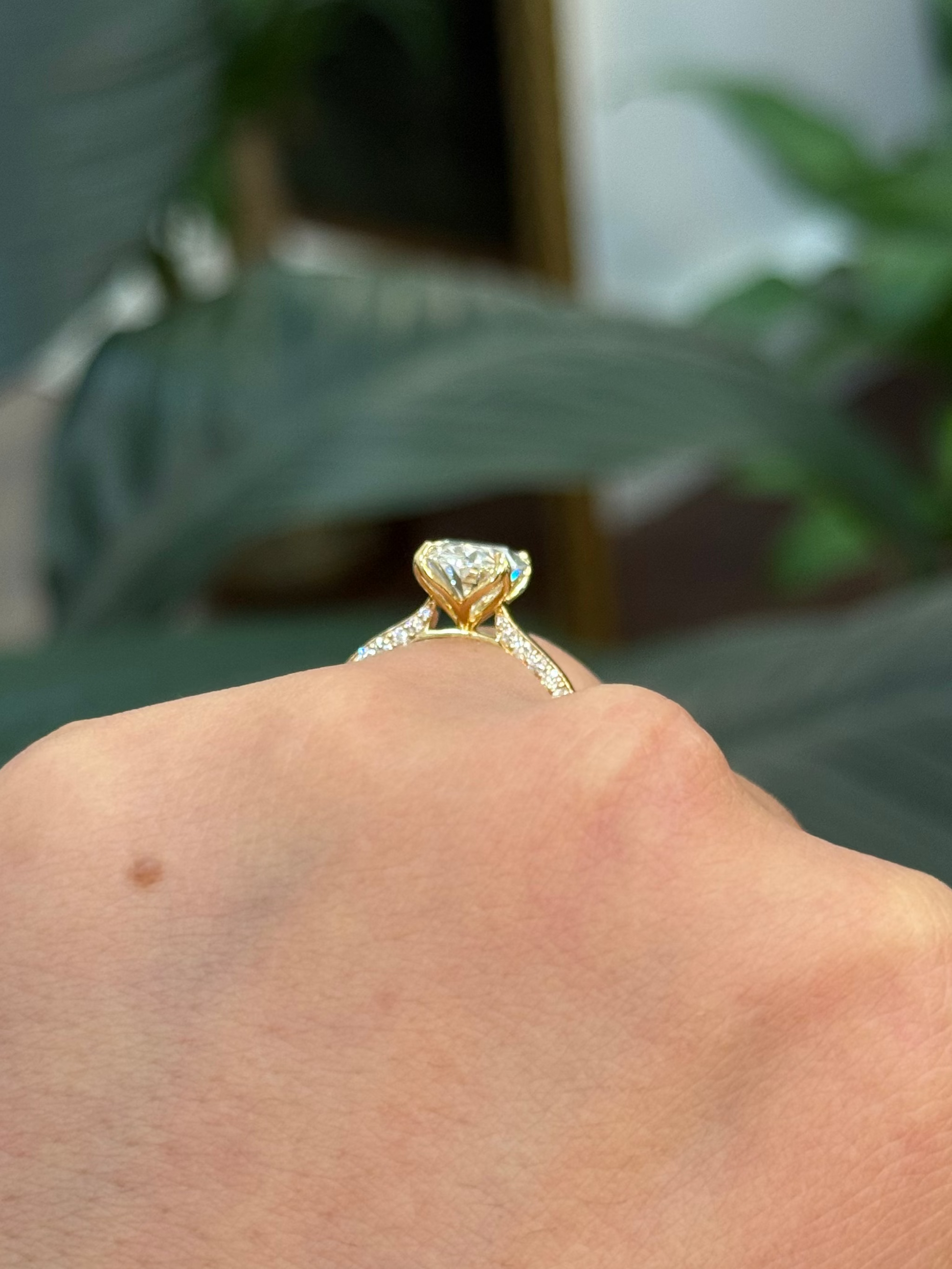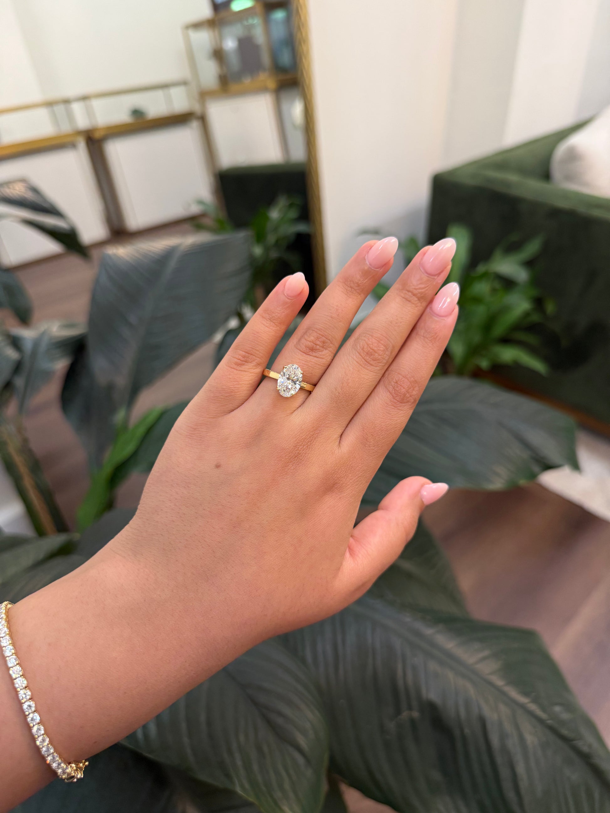 Our stunning tulip Solitaire features an Oval cut diamond set with four tulip petal prongs, forming a delicate yet detailed basket, and a hidden pavè band for that extra sparkle, set in 18k solid Yellow Gold band.