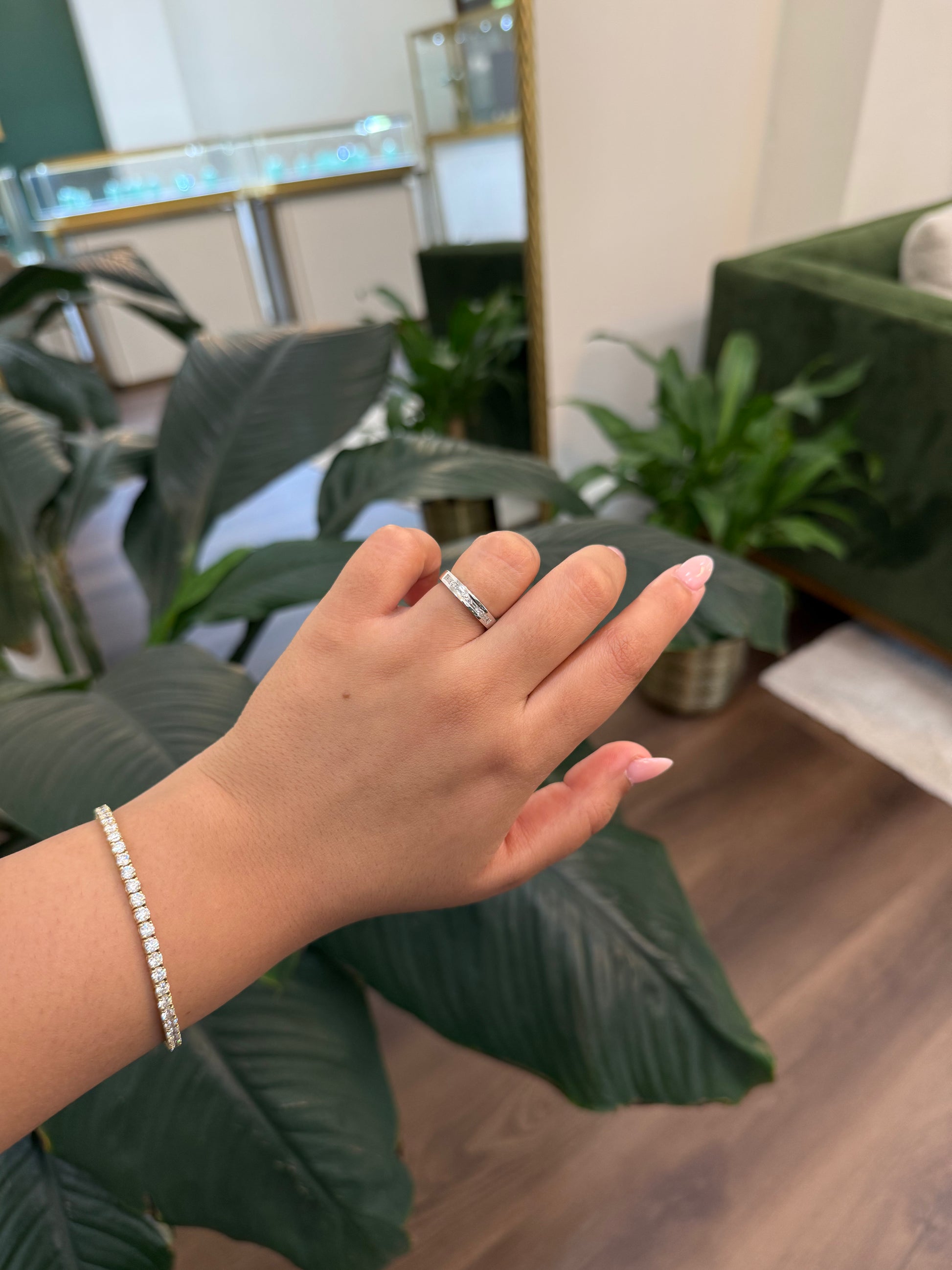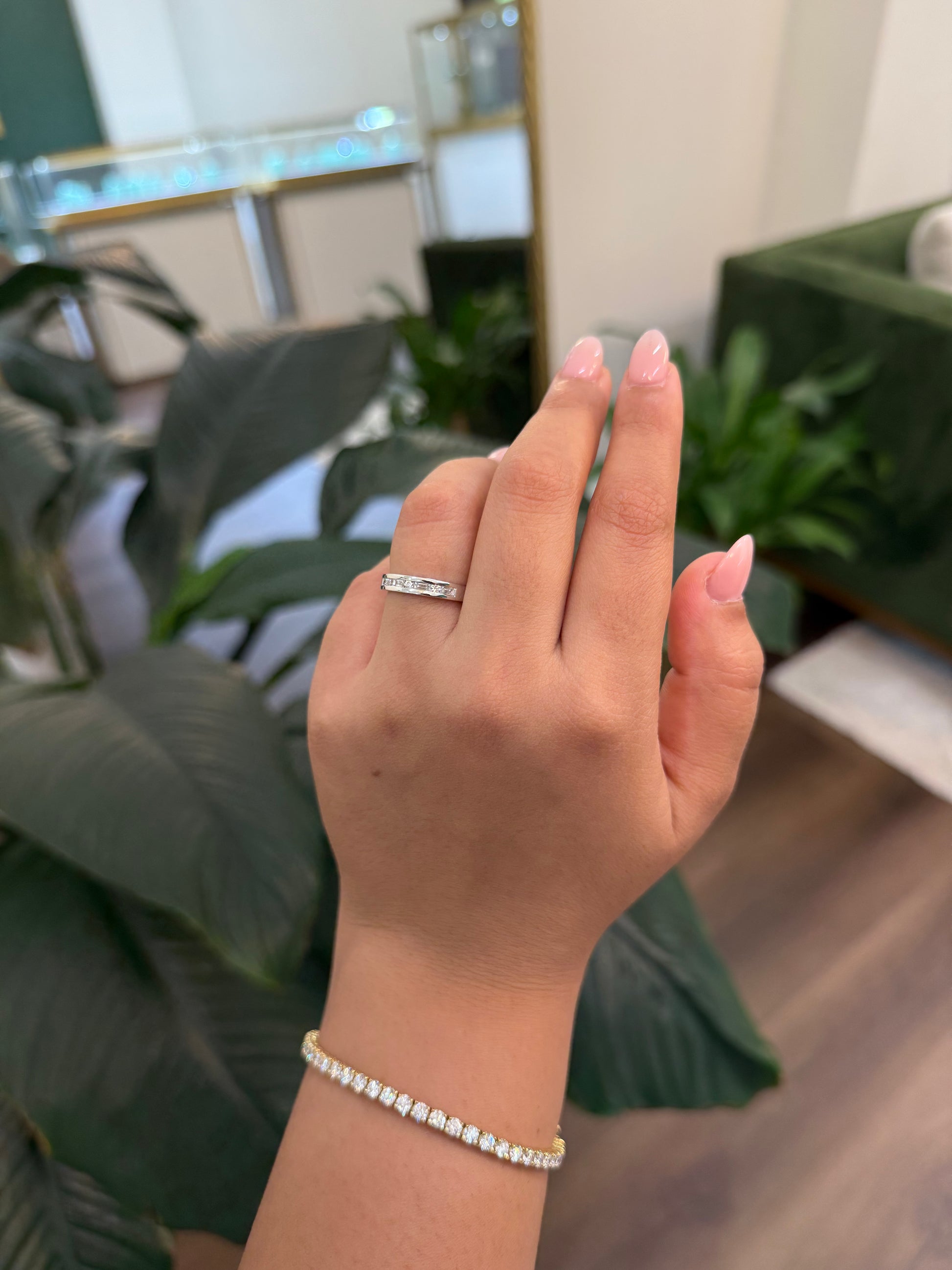 Laurel is a classic wedding ring design featuring an exquisite row of alternating round cut and Baguette cut stones nestled within a channel setting.