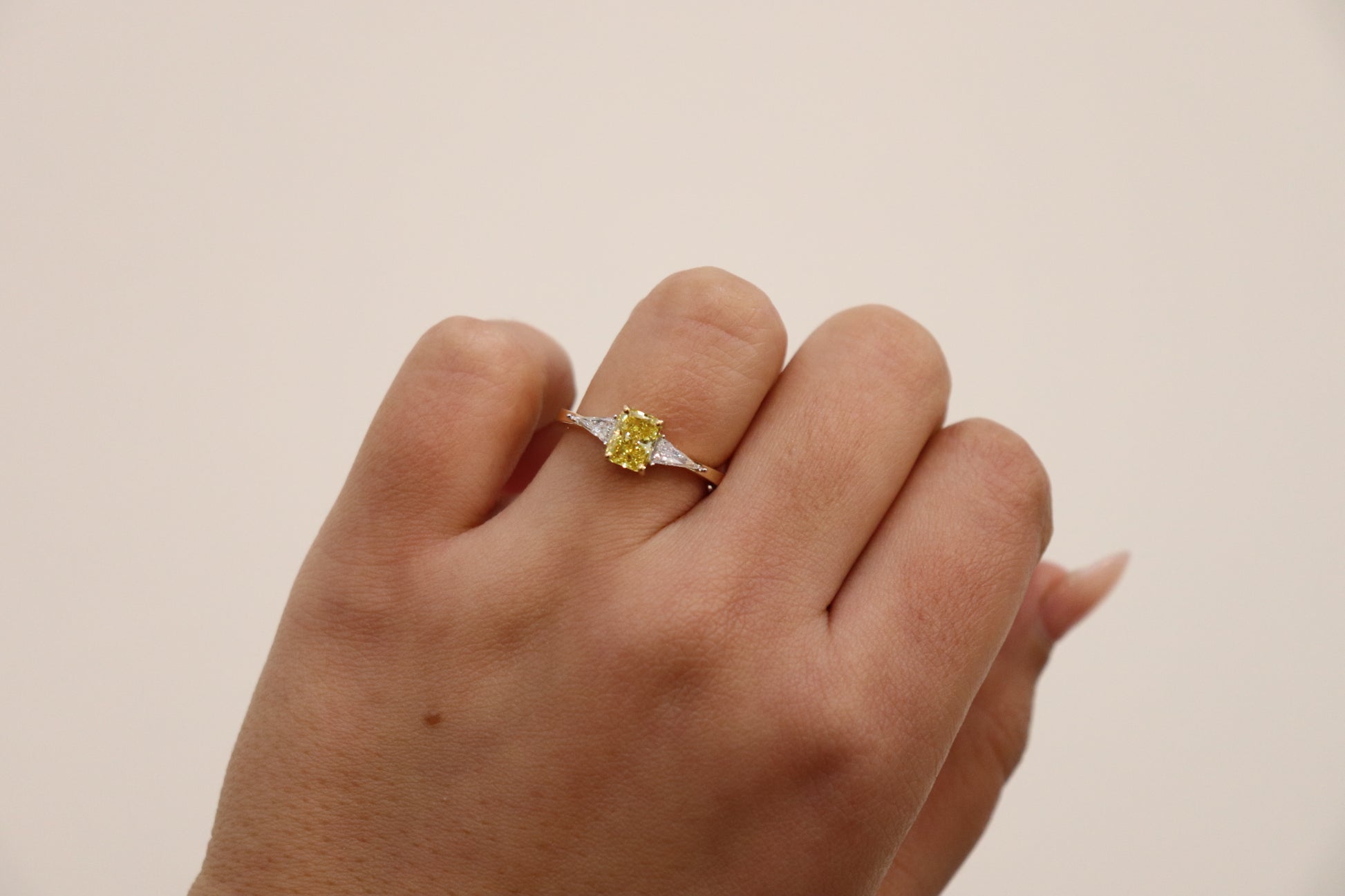 Vivid yellow Radiant set in with triangular stones on the side set in 18k yellow gold band in a low basket style setting.