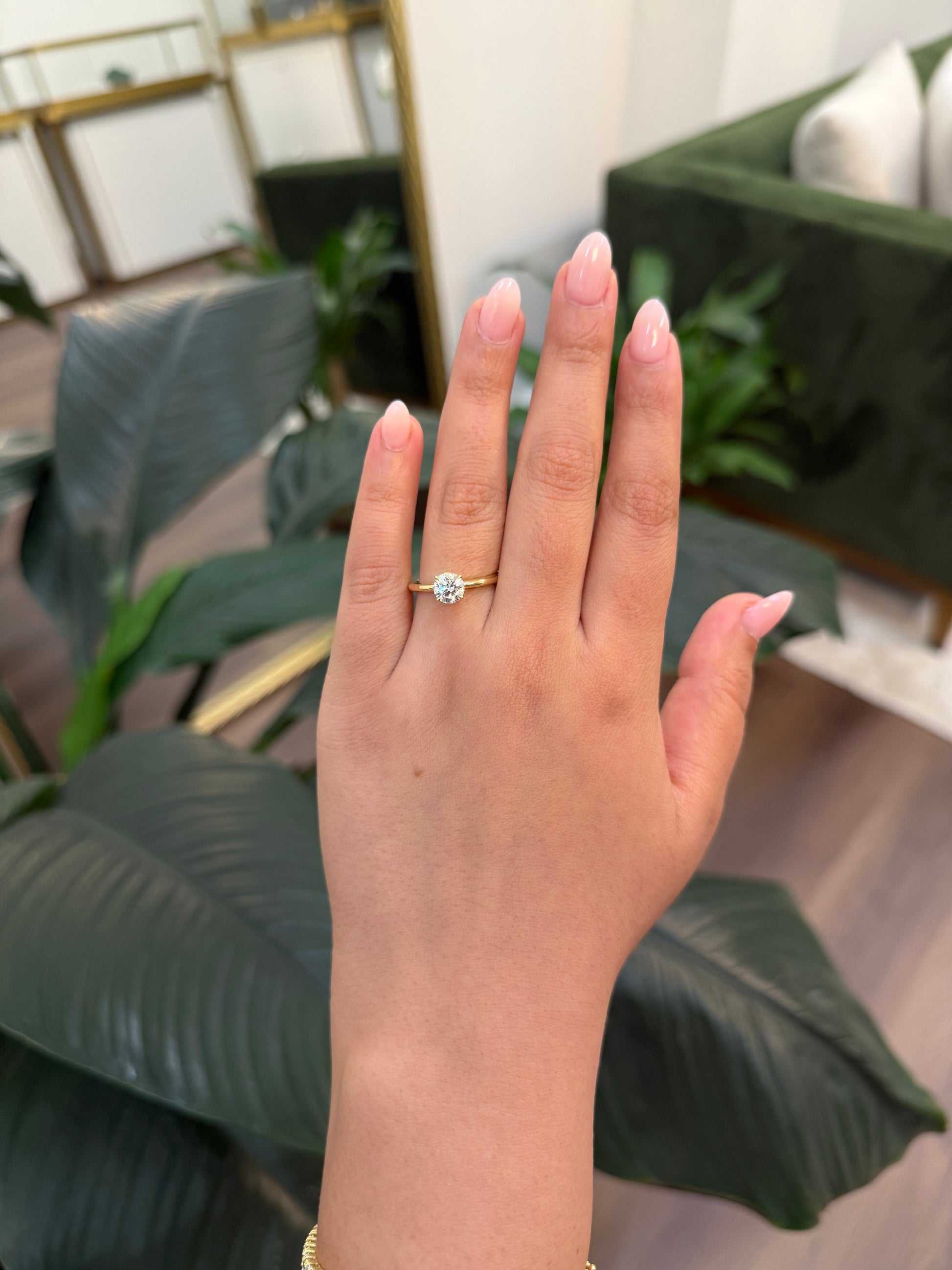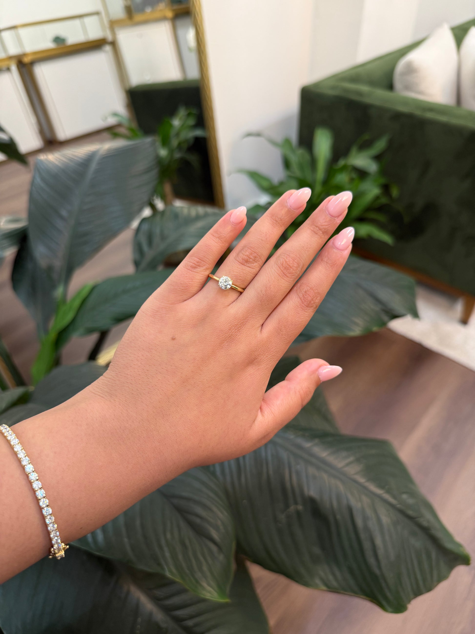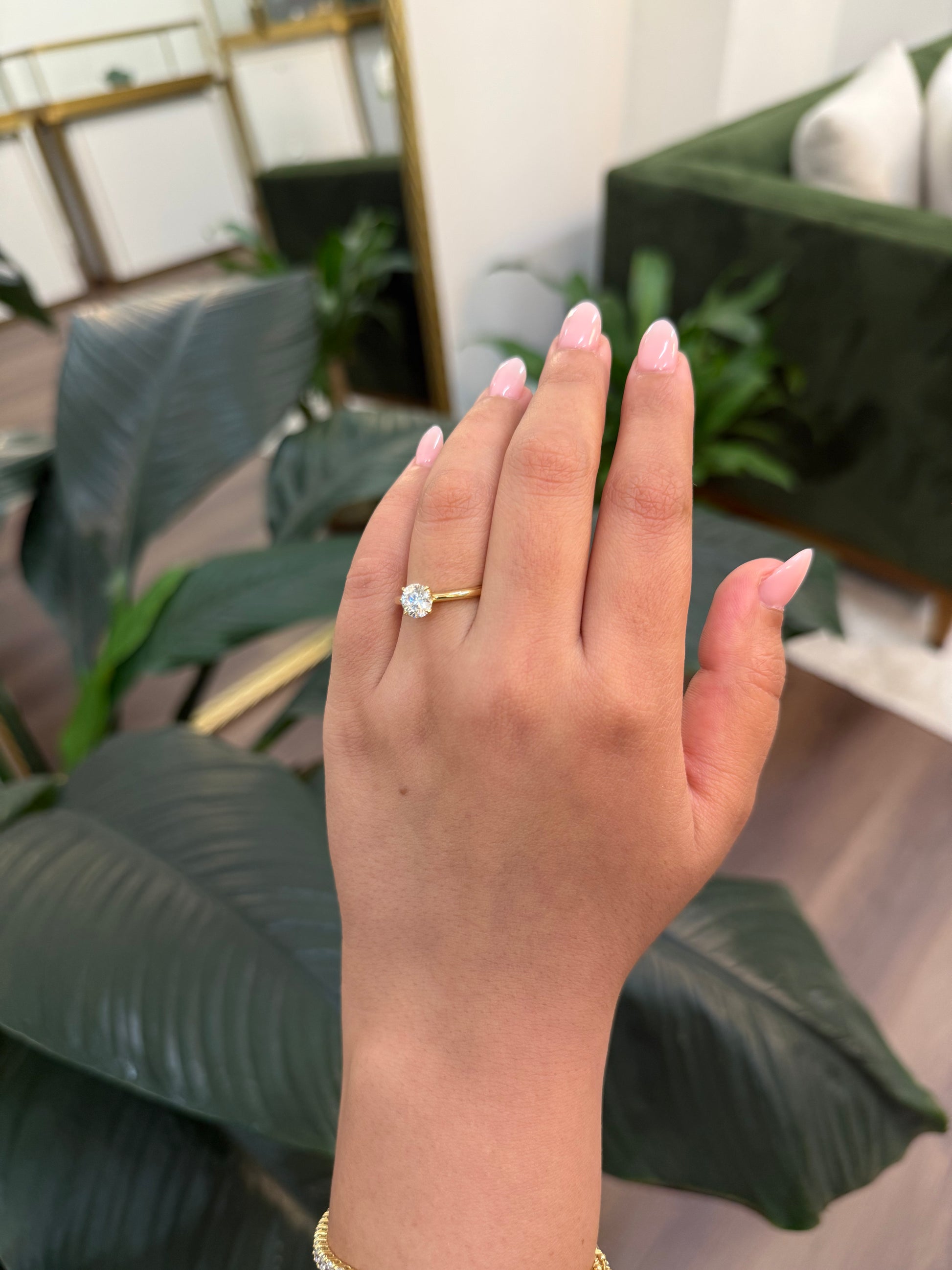 Sheila is our classic Round Brilliant cut solitaire in a 4 prong setting set in 18k Yellow gold Band.